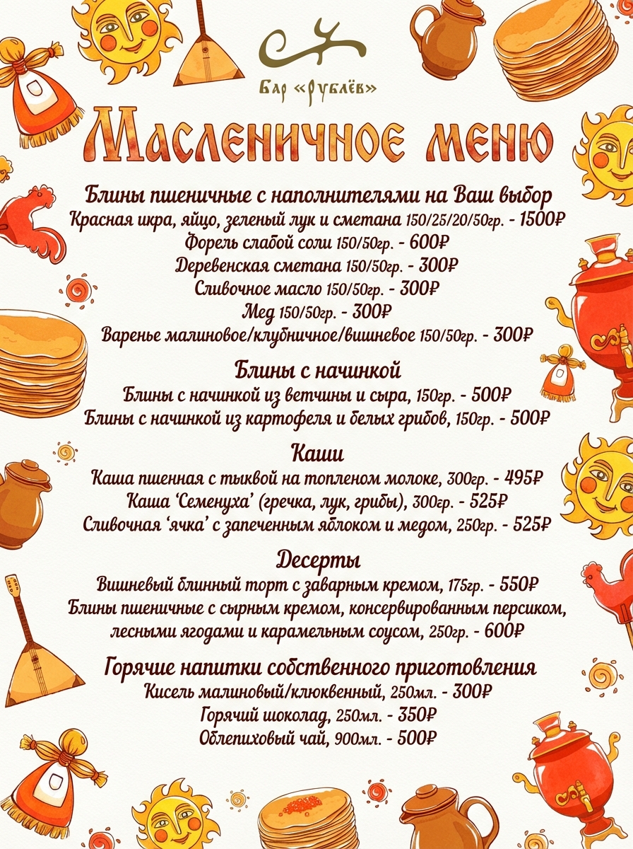 Мы подготовили для Вас особенное масленичное меню - это блины с множеством начинок, теплый напитки, каши, десерты и настроение, которое держится до весны!